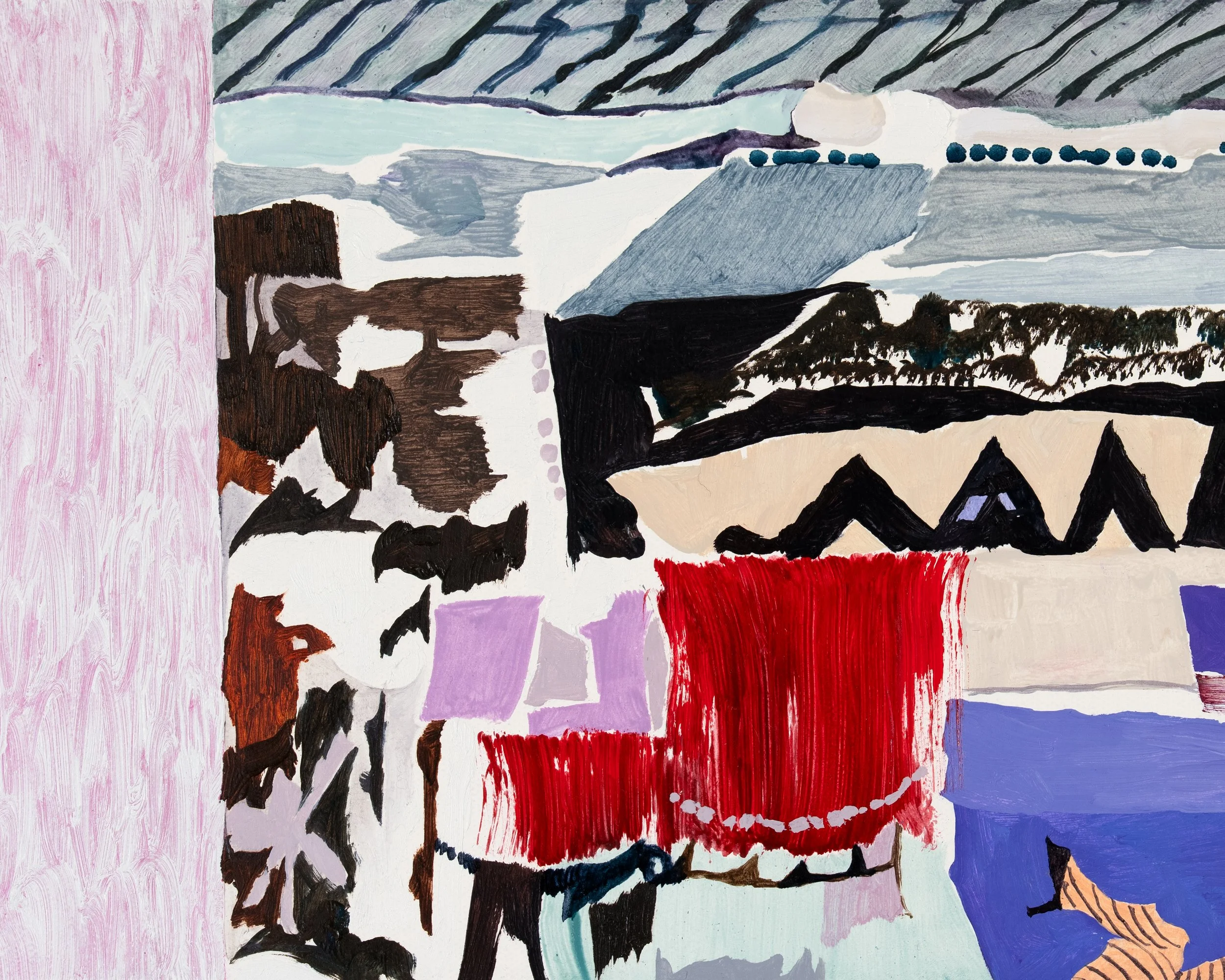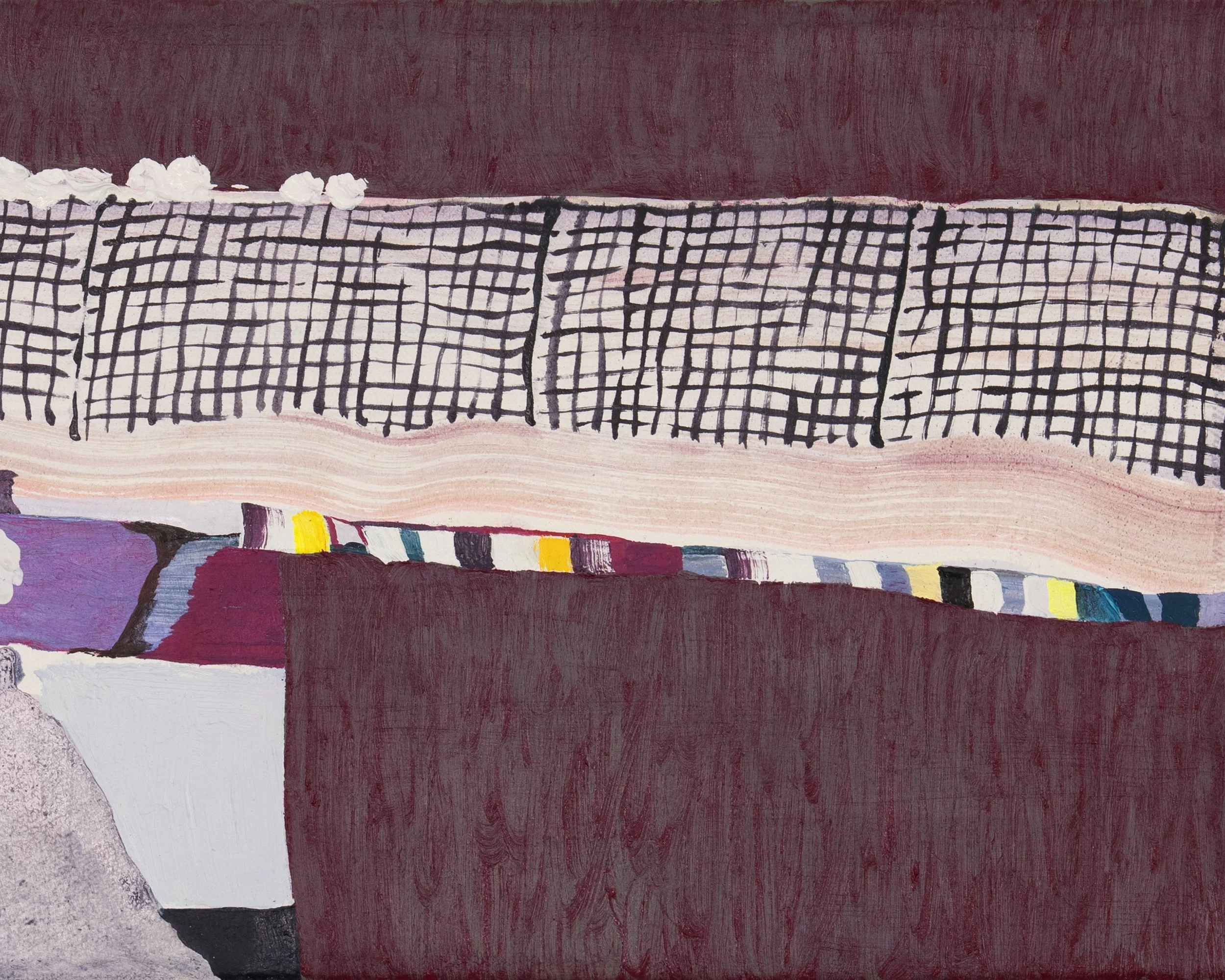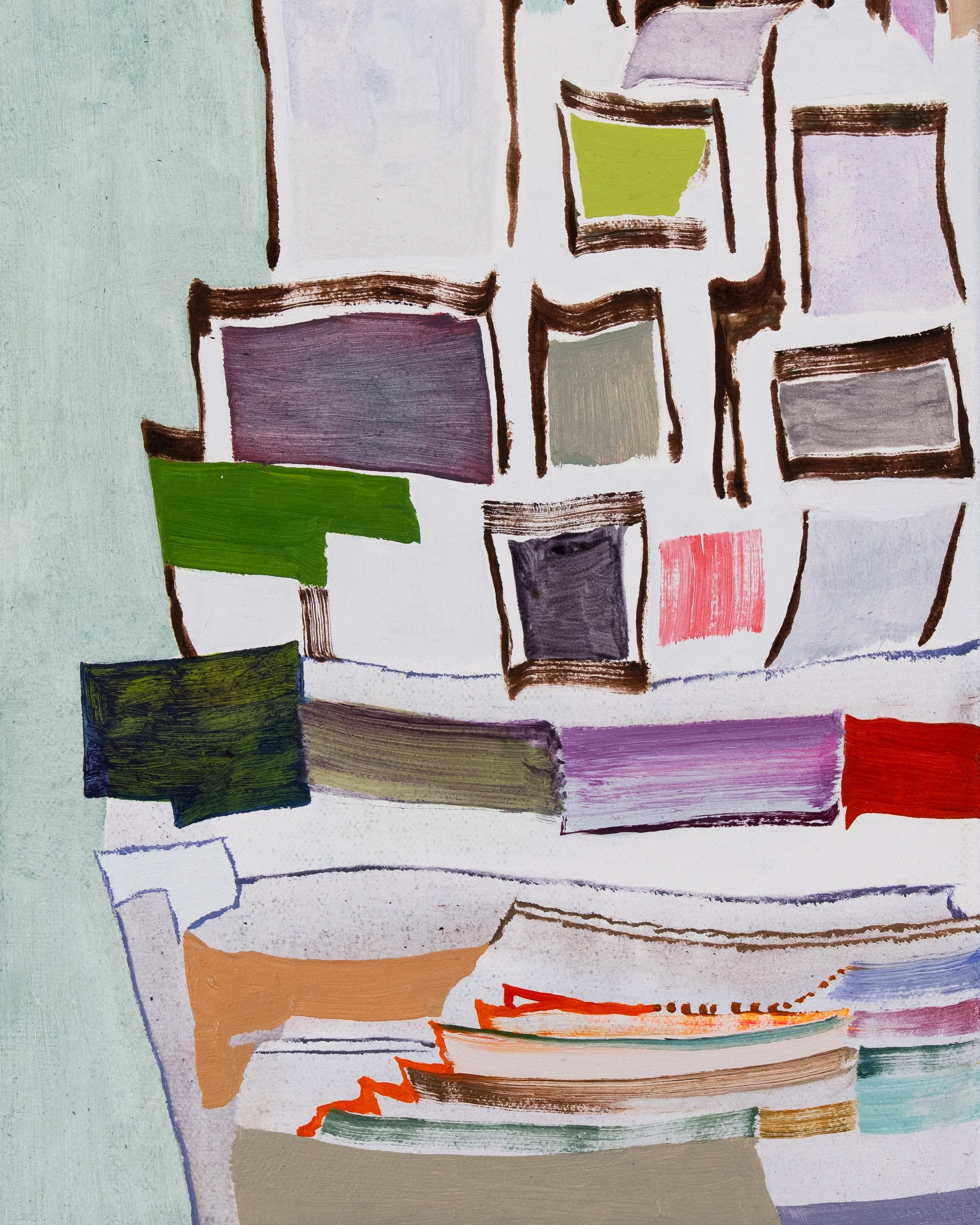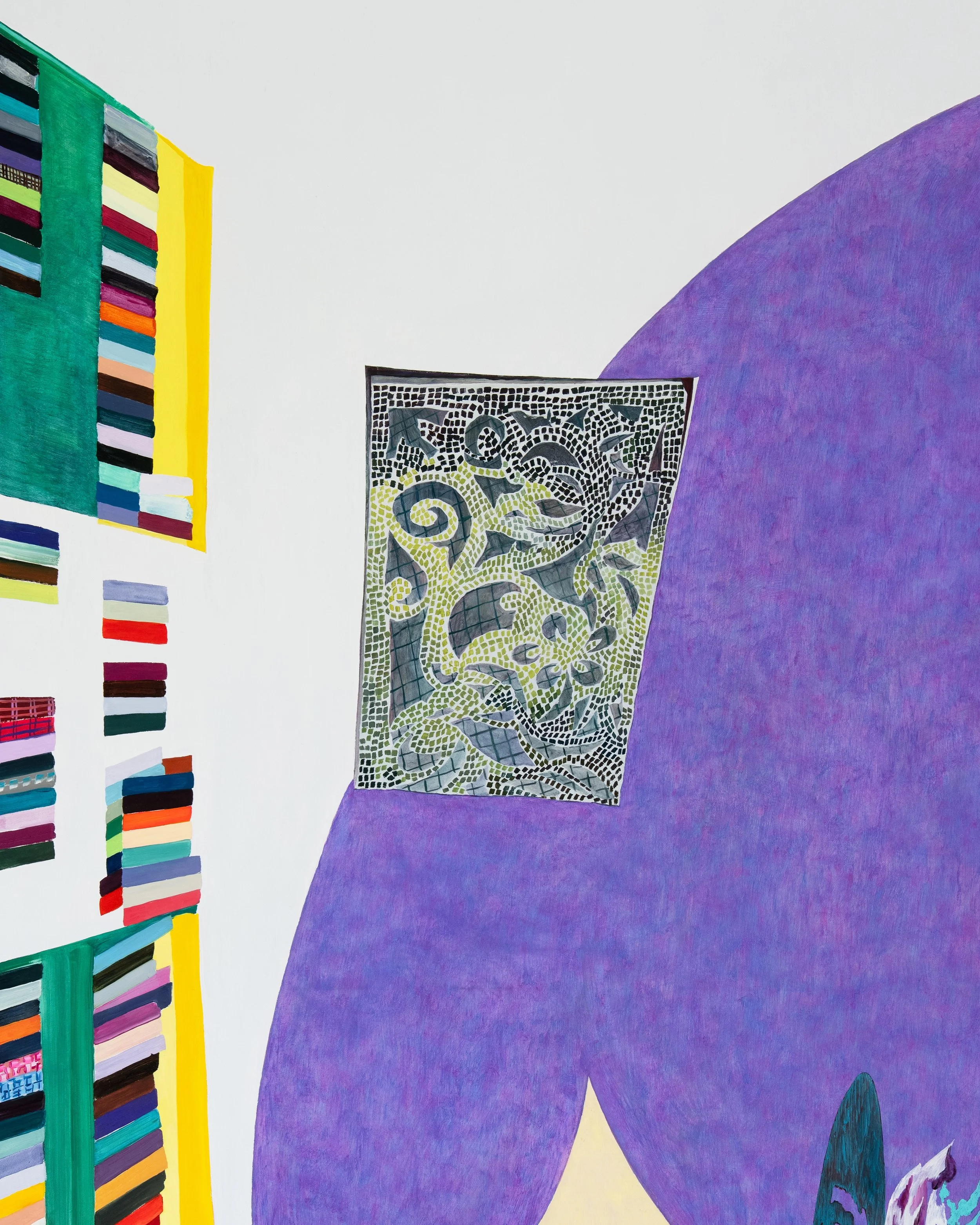 Snakes and Ladders unfolds as a process-based exhibition of abstract painting in which the visual elements of Lizzie Zelter’s wanderings intertwine unplaceable vertical and horizontal zones, like a game marked by shortcuts, mishaps, and chance encounters. Through layered color, rhythm, and brushwork, the works reveal worlds that exist within the cracks of the everyday: between the seams of the pavement, inside glass enclosures of shelving and displays, or in that ambiguous point where it is impossible to tell where a mirror begins or ends as it merges with the detail of someone’s clothing.